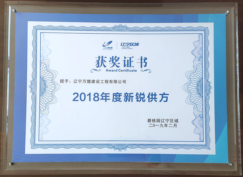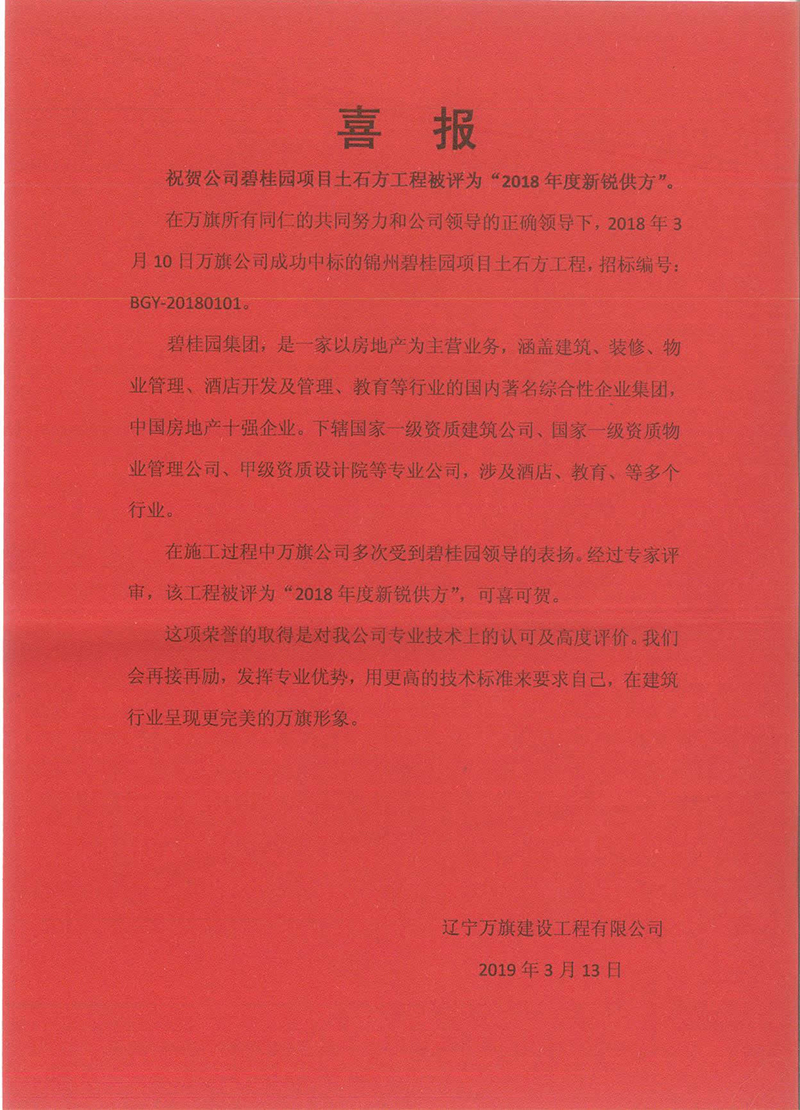 碧桂園土石方工程被評為“2018年度新銳供方”